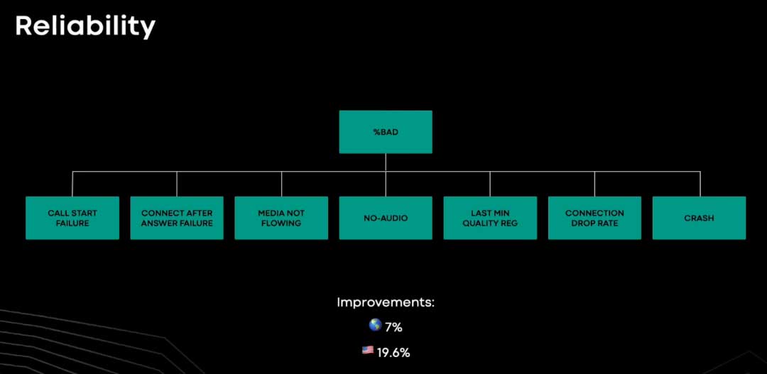 在 Meta Scale 运营中,重要的是不仅要查看对我们的服务有良好体验的用户百分比,还要减少有不良体验的用户百分比。如果某一天 10% 的通话会话出现故障,则意味着数以千万计的用户当天将获得糟糕的体验。我们通过引入复合指标应用名称百分比来解决此问题,该指标可以端到端跟踪不良用户体验。这个单一指标涵盖了呼叫连接失败、最后一刻质量回归、网络中断、媒体流问题和应用程序崩溃等内容,每个指标都根据它们造成不良用户体验的程度进行加权。通过专注于单一综合指标,我们能够衡量并改善过去 6 个月内不良的用户体验。我们发布了修复程序,解决了连接故障、网络丢失、媒体流问题和崩溃问题,全球不良指标百分比改善了 7%,美国改善了 19.6%,使音频和视频通话对于遭受最严重影响的用户来说更加可靠。