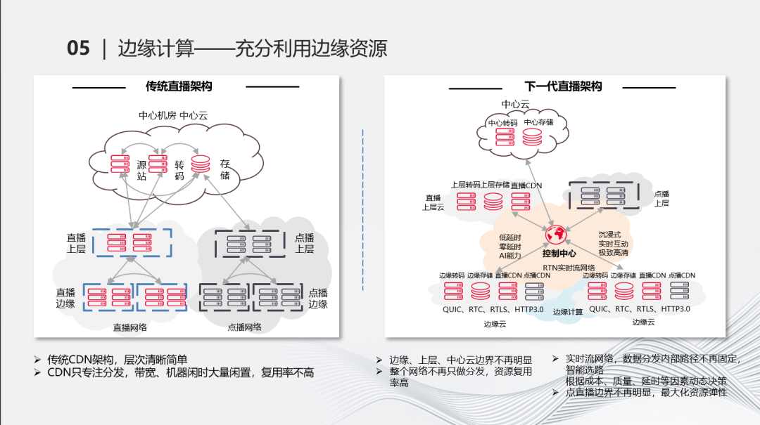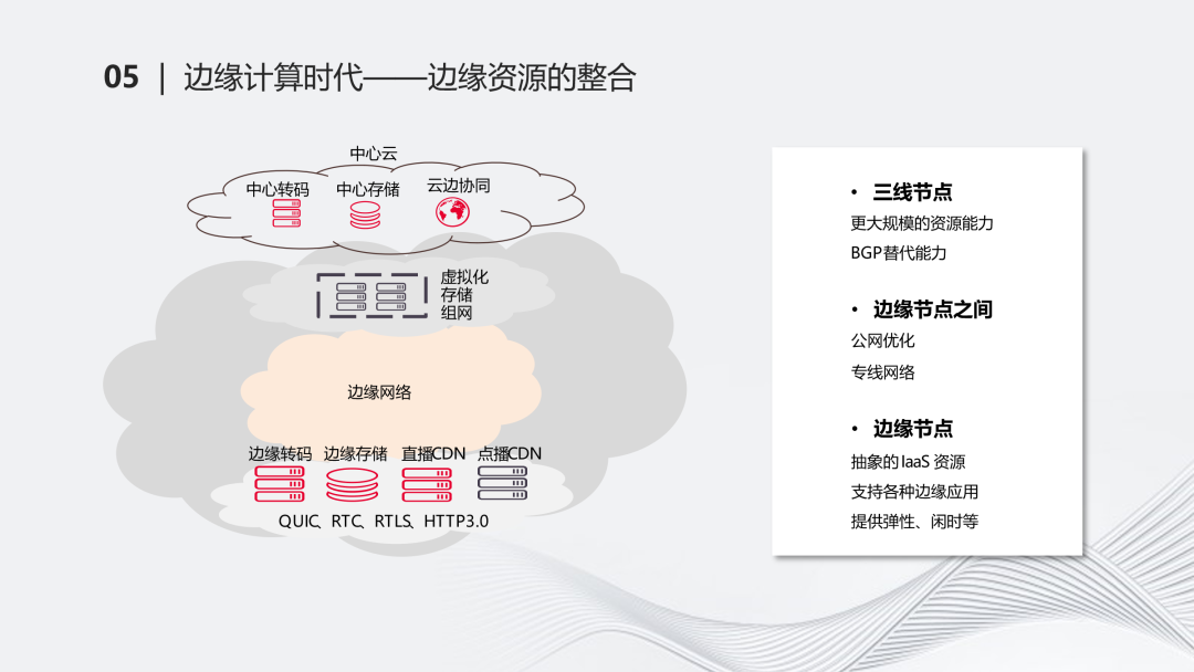 从中心往边缘下沉的思路,实际上也是边缘计算在做的。比如把源站转码这部分下沉,算力、存储这部分也逐渐下沉下来。我们本身的存储在源站时一直处于中心云的场景下,但从成本的角度要求我们在边缘的场景下也有存储。源站逐渐呈分布式化,而不是集中在一两个中心云的场景下。同时我们也希望利用边缘计算的能力,使边缘计算的弹性、复用、存储的能力有更深度的整合,让直播业务不再是孤军奋战的状态。