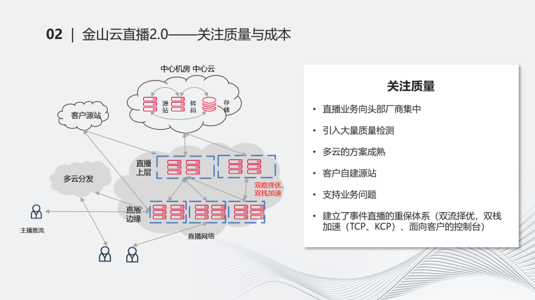 紧接着,进入到更升级的状态,大家开始关注质量和成本。这个时期,直播开始向头部的厂商集中。千播大战以后,很多其他的厂商开始逐渐聚拢起来,字节逐渐开始成为直播的头部。这个时期,一方面是直播集中开设后,我们接触的甲方逐渐开始关注质量。我们引入了很多质量检测的方法,包括额外的第三方检测的内容。另一方面,在多云分发的场景下,我们也融合起来了。例如金山云的直播与其他云的方案融合起来去实施。整个过程是我们逐渐把它做成熟的过程。从业务向头部厂商集中开始,客户也开始自己建源站,自己做这些源站的内容。所以我们也要把直播的流推到其他的源站上。