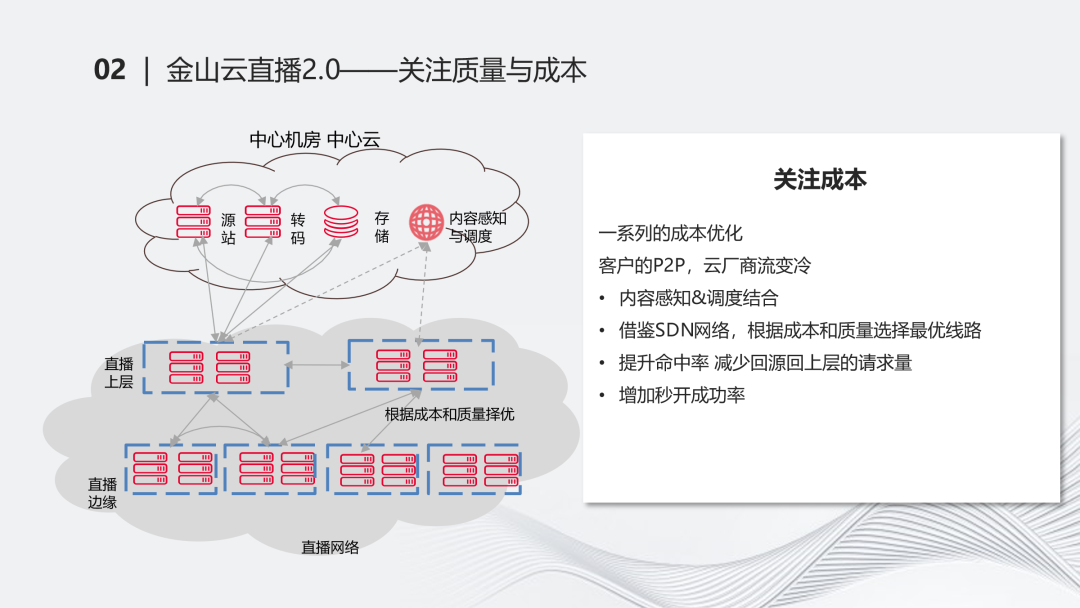 关注完质量后,也要关注成本。我们做了一系列成本的优化。在这个时期,客户也开始做P2P速的能力。我们云产商这部分直播的量会从很热的状态会变成比较冷的情况,这种情况下,在成本上会比较受限。我们加入了内容感知和调度结合等能力,最终可以调度到每条流。每条流可以从需要来回穿梭的过程转化为直接指到相关的上层上去,降低了回源或者向上层请求流量的情况。