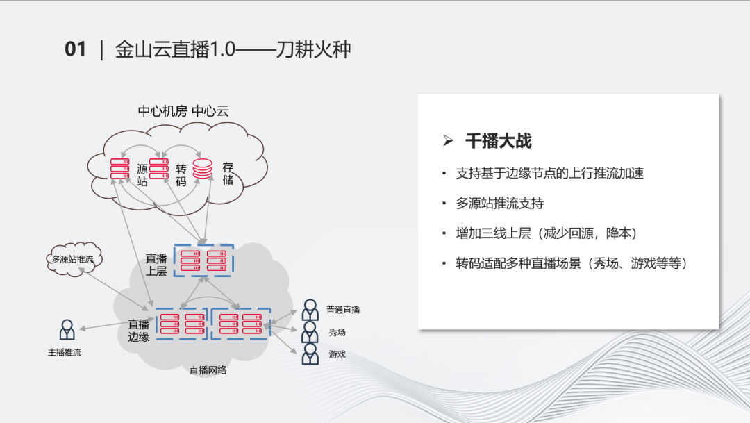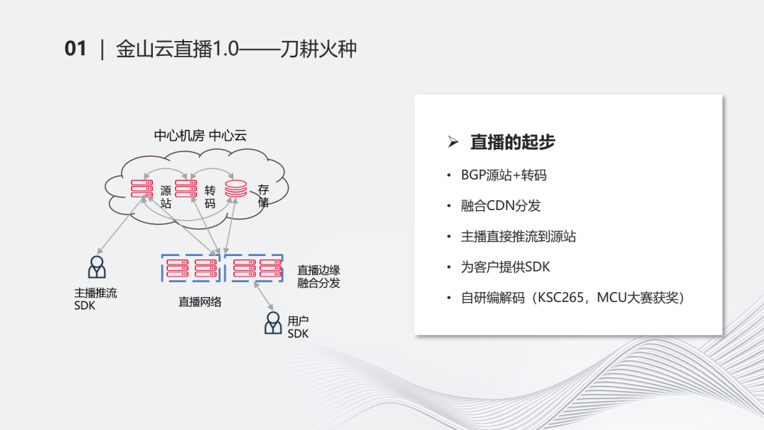 首先看直播的情况。最早在2014、2015年,金山云开始做直播相关的业务。最早的时候是一个比较简单的架构,我们称之为刀耕火种。左边这张图,主要是BGP源站+转码的能力,融合CDN分发,为客户提供SDK的能力。主播直接通过推流的方式把内容推流到源站,再通过边缘场景进行融合分发。