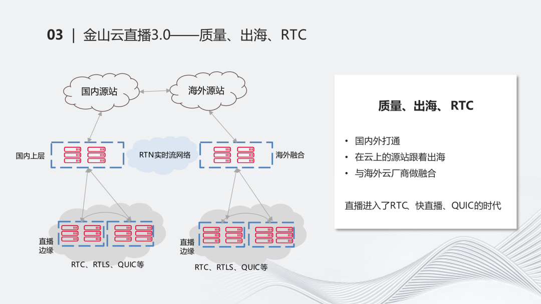 紧接着,我们跨到了疫情时期。这段时期RTC爆火,我们当时做了几件事情。第一是直播的出海。这个过程中,我们面临的是整个海外源站和国内源站打通的问题,在海外怎么建设网络,以及和海外的相关的厂商进行融合的问题。一方面,我们在海外不一定能自建网络,需要和海外的融资商进行融合。另一方面是回国的情况比较艰难,所以和国内外的打通、云上的出海比较困难。我们及时做了RTC相关的产品和调用,这个时期,直播也进入了RTC、快直播的时代。原来的直播可能延迟十几秒,在RTC这个时代我们可以做到秒级的延迟。海外对QUIC会更加友好。基于UDP的协议在海外受的限制较少,我们逐渐增强了QUIC的能力。现在,金山云的QUIC在业内和大家不分伯仲。QUIC本身在国内比较受歧视,国内对于UDP的限制比较多,QUIC目前在国内并没有完全发展起来,但我们在国内也有了不少应用的场景。