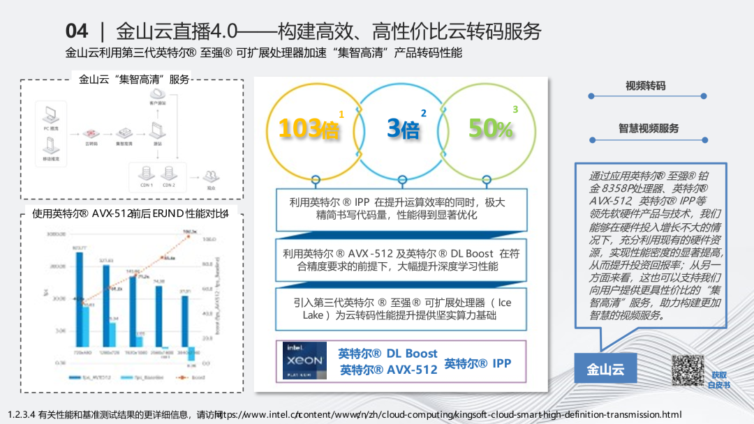 在这个过程中,转码的流量有了爆炸式的增长,增加了很多倍。我们引入了诸如像英特尔8358这类高性能计算的能力的CPU,帮助我们解决了转码、边缘计算的问题。英特尔的这些CPU实际上有很高的CPU密度,比如8358P达到了128核的状态,它的下一代8458P达到了160核。在CDN的场景下用这种CPU的次数不多。因为在CDN的场景下,更多的是大流量转发,对核数的要求不高。但对于高性能计算的场景,无论是计算密度或本身计算的单核效能都显得很重要。单核的效能,转码对延迟很敏感,核多的时候,主频下来后会影响转码的延迟性。8358和8458比较好地兼容了两者的能力。另一方面,在边缘计算的场景下,也需要很多核。在计算类的场景下,更多需要的是核多,而不是很专业的系统。核越多,越有利于我们在资源上做更好的运营和售卖的能力。