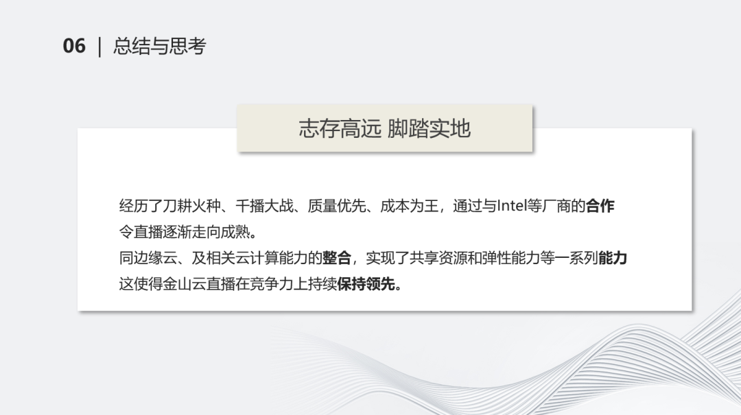 最后总结一下:直播经历了刀耕火种、千播大战、质量优先、成本为王的时代,包括和厂商进行深度合作、引入更高效低成本的资源的时代,逐渐走向成熟。和边缘云、相关计算能力进行整合,使我们在共享资源和弹性能力上获得进一步提升,得以在这场技术升级中取得新收获。