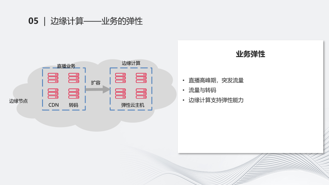 同样的,流量分发和转码的能力如果在这种突发情况下,我们把它的弹性接得好,客户的满意度会更好,也会对我们带来更好的营收状况。所以边缘计算通过弹性云主机的能力可以很好地提供相关的弹性支持,虽然不是百分之百,但至少能提供相当一部分。