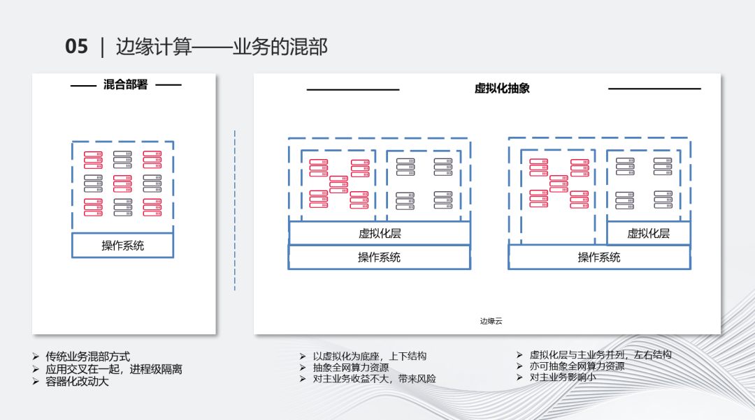 右边的图就是虚拟化抽象的基本逻辑,在这基础上又分为两个思路。左边是一个特别正常的思路,在操作系统上有一个虚拟化层,在这上面跑了很多云主机,分别把两个业务放在不同的虚拟机里面。但这还是会面临类似的问题,有些业务直接迁到虚拟层上后,大家会很怀疑这个虚拟层是否足够健壮,是否能够支撑复杂或高负载的业务。这种做法有助于提高整体整合能力,但业务风险比较高。尤其是在虚拟化的场景下,做不好就可能出现相互打架的情况,高负载的情况下更有可能。这种上下结构会面临的问题是,边缘计算的业务收益可能很大,但对上面跑的其他业务收益不一定会很大。