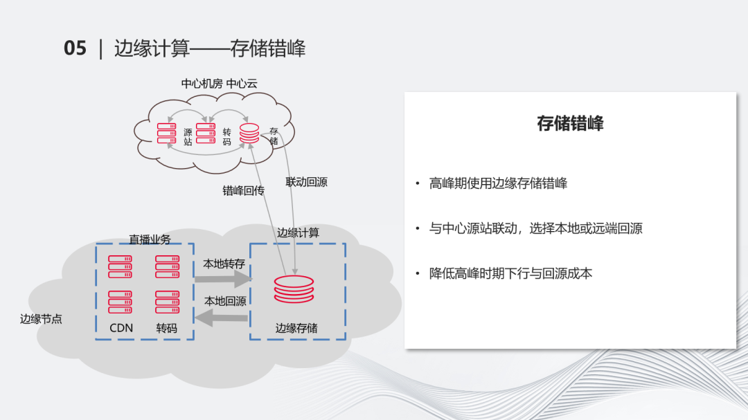 另外一方面是存储方面的错峰。金山云的边缘计算已经做了分布式的对象存储,即在整个分步的环境下,在全网的场景下,我们提供了统一命名空间的对象存储能力。对直播来说可以做一些错峰回传和联动回源的能力。例如在高峰期,把相关的流推到边缘节点的存储上,就可以降低很多在高峰期下行带宽的能力,这样对于诸如95计费的能力而言,能够起到很好的降稳作用。当我们在访问源站的存储时,这个数据可能本身还存在在边缘存储这个点上,所以我们需要和边缘云的存储能力进行联动,使得我们在访问中心存储时能够把它指到边缘存储的位置上来,相当于有一个路由,通过一些能力能够把这个数据最终调到边缘存储上。这是一个典型的错峰逻辑,基于这种逻辑,进一步节省了在直播高峰期上下行的带宽能力。