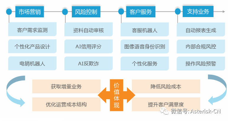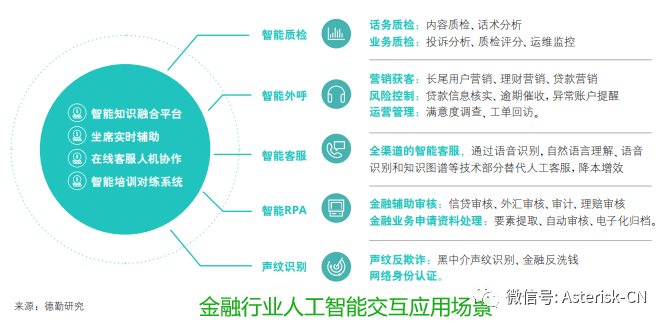 金融行业的呼叫中心是利用AI智能语音接入最多的行业,我们可以通过以下图例看到当前金融行业呼叫中心和智能语音的整合情况。这是一种非常典型的基于AI的强业务用户场景。业务流程数据通过AI完成处理流程,降低人工干预的可能性。