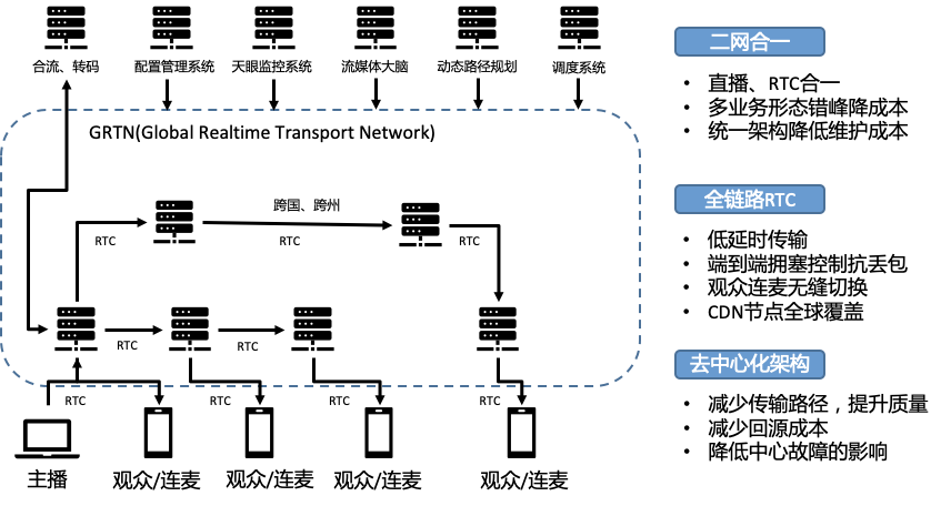 从直播内容生产到用户在直播间看到,需要经过一个复杂的CDN传输网络,传统的RTMP和HLS协议延时较大,随着5G的兴起,出现了连麦、直播答题等低延时内容形式,传统协议已经无法完全满足业务诉求。因此,淘宝和阿里云一起,建立了通信、直播二网合一的低延时传输网GRTN,实现了全链路RTC传输。配合CDN的基础设施,淘宝从0到1建设了RTC流媒体传输协议,在主播推流侧和手淘播放侧对GRTN做了率先的业务实践,成功落地淘宝直播且实现了全量覆盖。