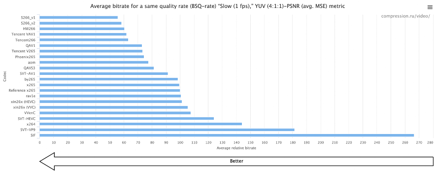 S266提供了对比H.265开源软件X265 very slow档50%的编码效率提升(同等画质下,码率减少50%),夺得此次MSU比赛中PSNR等多个指标的第一名。