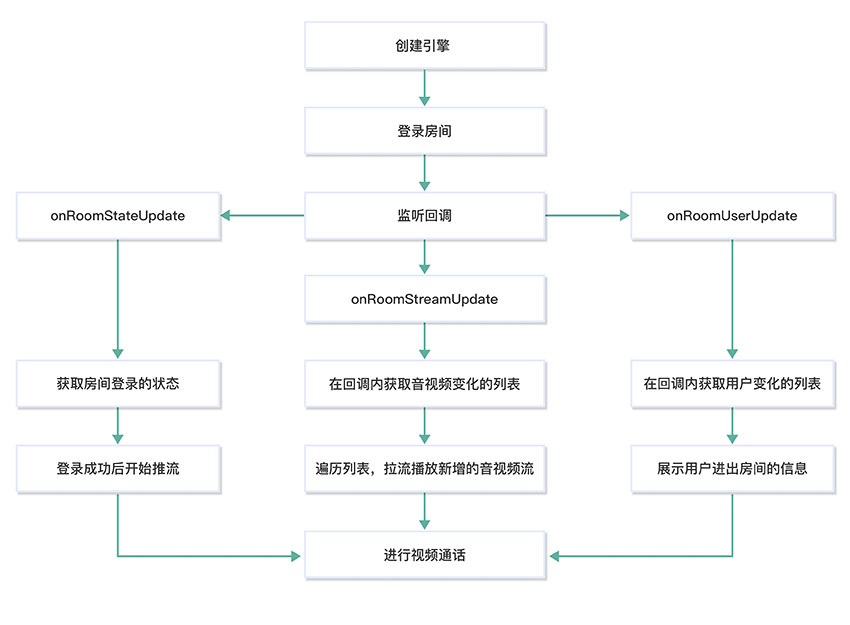 下面就来介绍如何基于 ZEGO Express SDK 4 步在Android应用内实现多人视频通话,流程图如下: