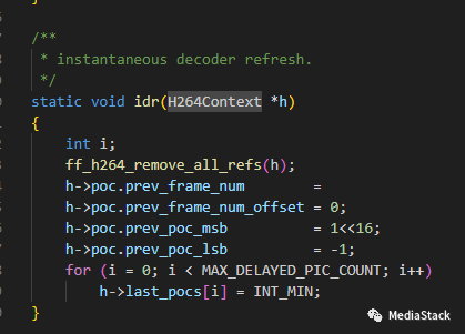 IDR函数处理 H.264 解码过程中的瞬时解码器刷新 (IDR) 事件:调用 ff_h264_remove_all_refs 删除对先前解码图片的所有引用,确保解码后续 IDR 图片和任何相关图片的干净状态。