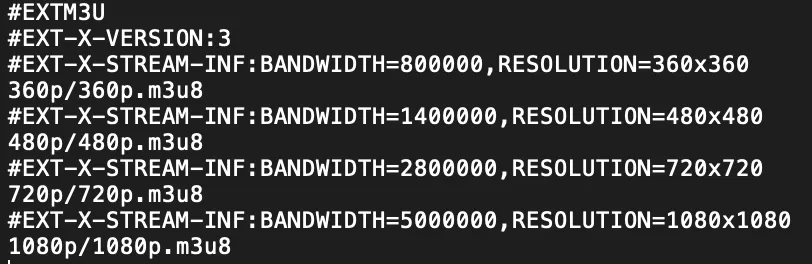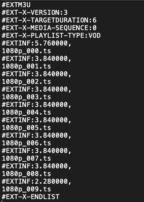 如前所述,这些文件是从主播放列表中引用的。每个版本都有自己的媒体播放列表。这些媒体播放列表文件通常包含按顺序排列的文件条目。这些条目通常会提及文件的持续时间。