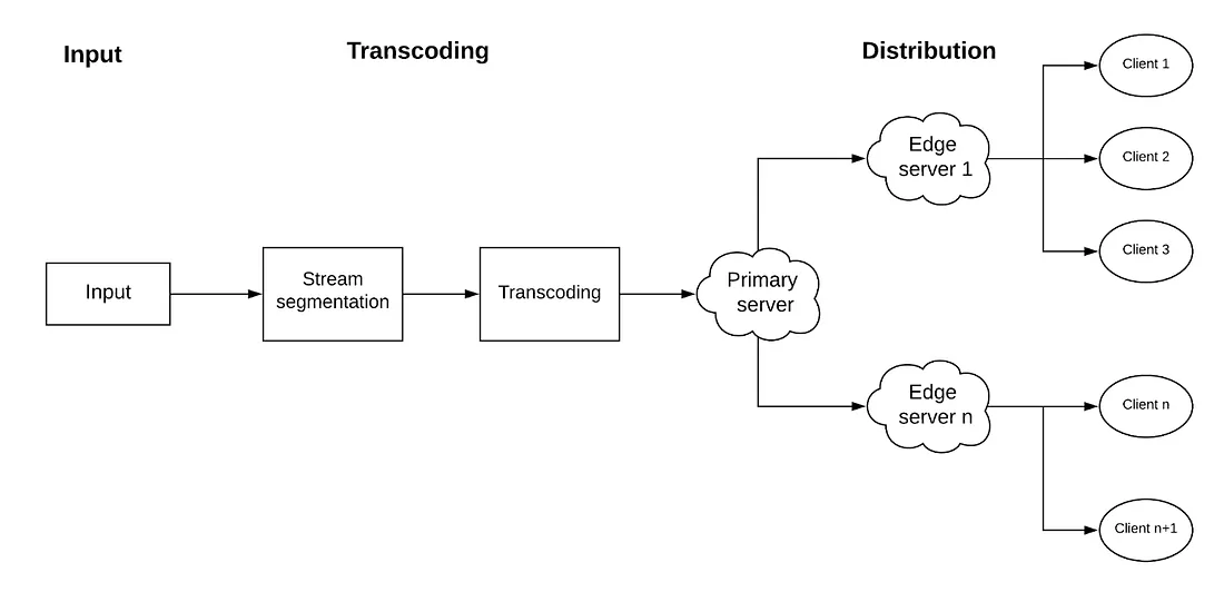 在典型的实时流中,不同的步骤包括输入、流分割、转码、分发和最后的客户端回放。