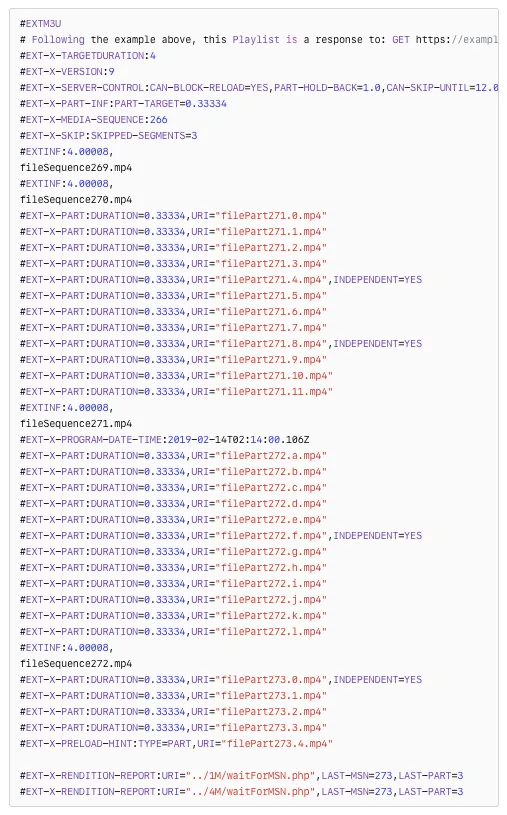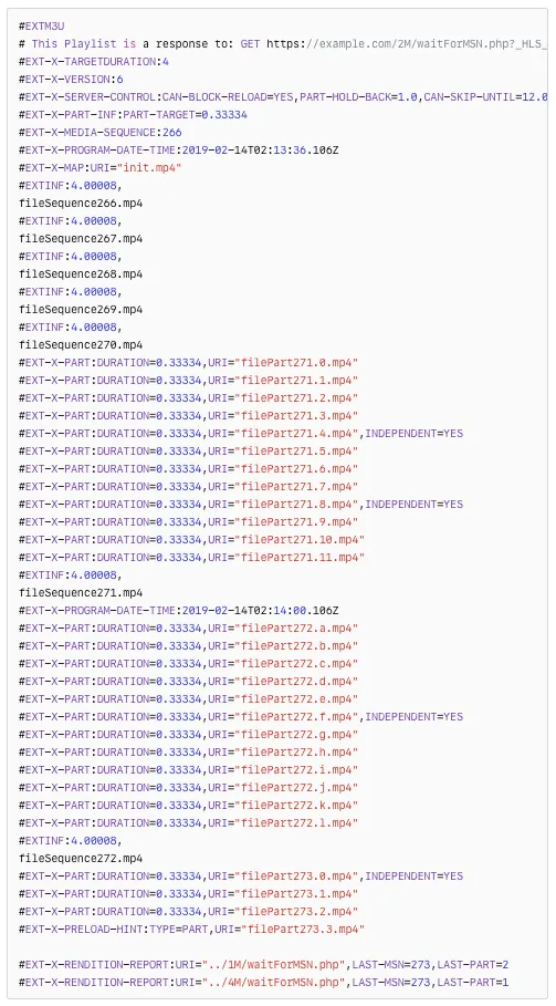 HLS 播放列表可能非常庞大。为了获取最新内容而反复多次获取播放列表及其内容是一种浪费。为了缓解这一问题,Apple 引入了 Delta 更新。在这里,客户端只需获取一次完整的播放列表。之后,玩家就可以申请 Delta 播放列表。Delta 播放列表包含完整播放列表的一些最新片段和片块。