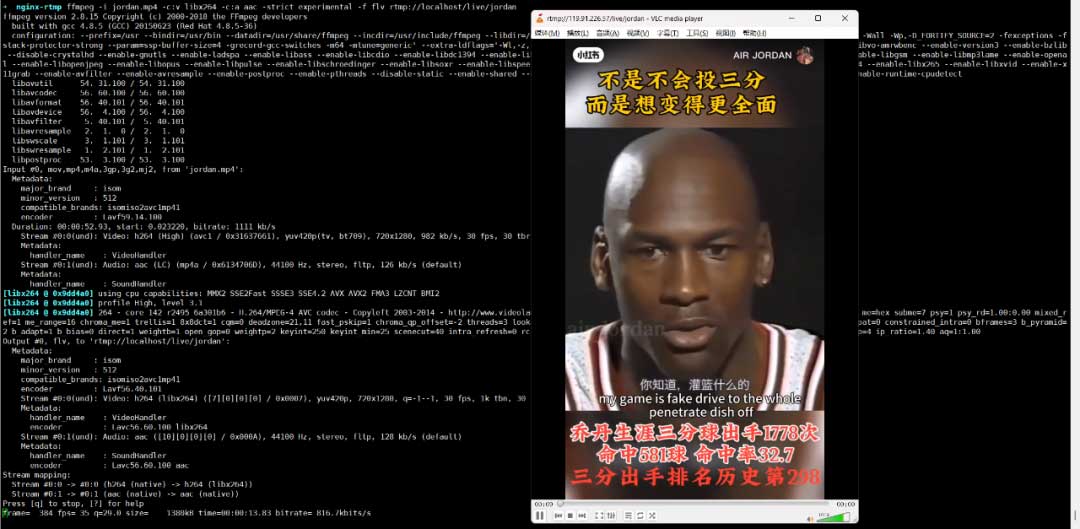 ➜ ffmpeg -i jordan.mp4 -c:v libx264 -c:a aac -strict experimental -f flv rtmp://localhost/live/jordan