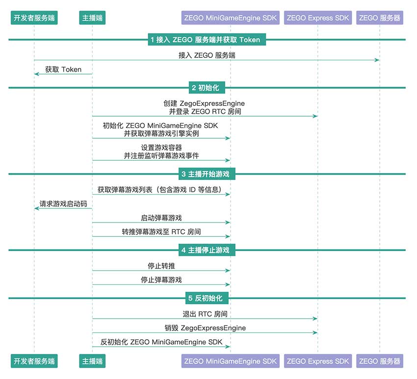 请参考 服务端 API – 调用方式 了解如何接入 ZEGO 小游戏产品的服务端,并在您的服务端上实现 获取游戏启动码,以便后续主播启动弹幕游戏前获取游戏启动码。