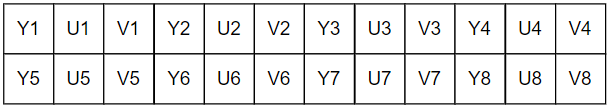 YUV 4:2:2 打包模式存储下,唯一平面为 8×2 的数组,每个 Packed 内部的顺序为 Y U V Y,并且遵循两个 Y 共用一组 UV 的特征,其得到的 YUV 格式为 YUVY(和 Packed 内顺序一致)。类似的,按照 Packed 内各分量顺序不同,还可以得到 YUV 类型 VYUY 和 UYVY。