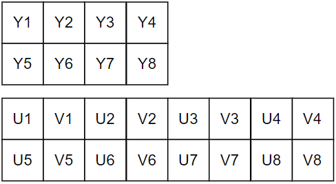 - 第二行需要采样 4 个亮度分量 Y,4 组色度分量 UV