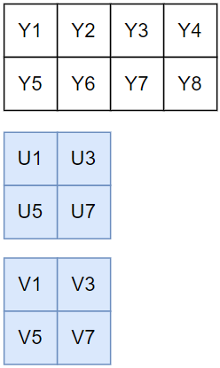 YUV 4:2:0 平面模式存储下,三个平面分别为 4×2、2×1、2×1 的数组,若后两个平面先存 U 后存 V ,则得到 YUV 类型 I420。若先存 V 后存 U ,则得到 YUV 类型 YV12。