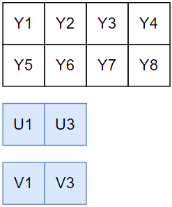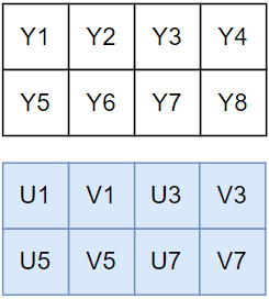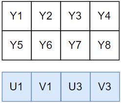 - 第一行需要采样 4 个亮度分量 Y,2 组色度分量 UV