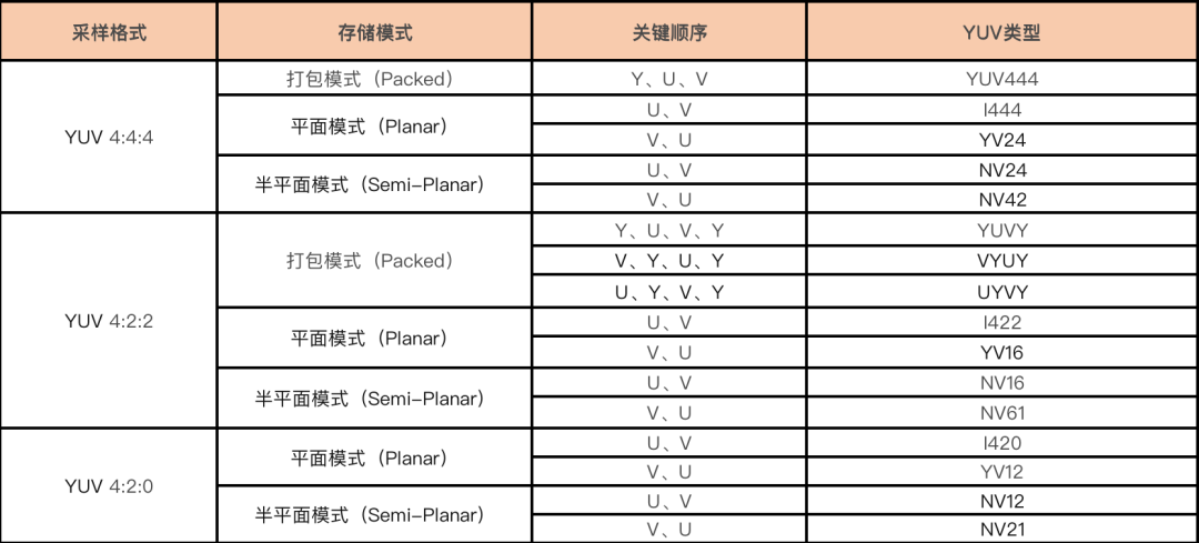 为方便查阅,我们再将上面提及的,不同采样格式、存储模式、UV 存储顺序以及 YUV 类型的匹配关系,通过表格整理一下: