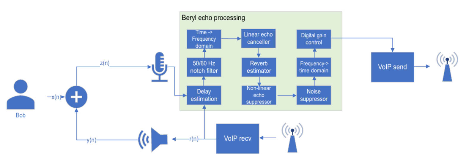 在上面的例子中,抑制回声的一种方法是在爱丽丝说话时衰减鲍勃的麦克风信号。虽然这可以确保爱丽丝永远听不到自己的回声,但这也意味着鲍勃永远无法在爱丽丝说话时打断她–这就是众所周知的对讲机效应。一个好的 AEC 的目标是抑制回声,并允许两个参与者同时说话(AEC 的通俗说法是 “双声道”)。