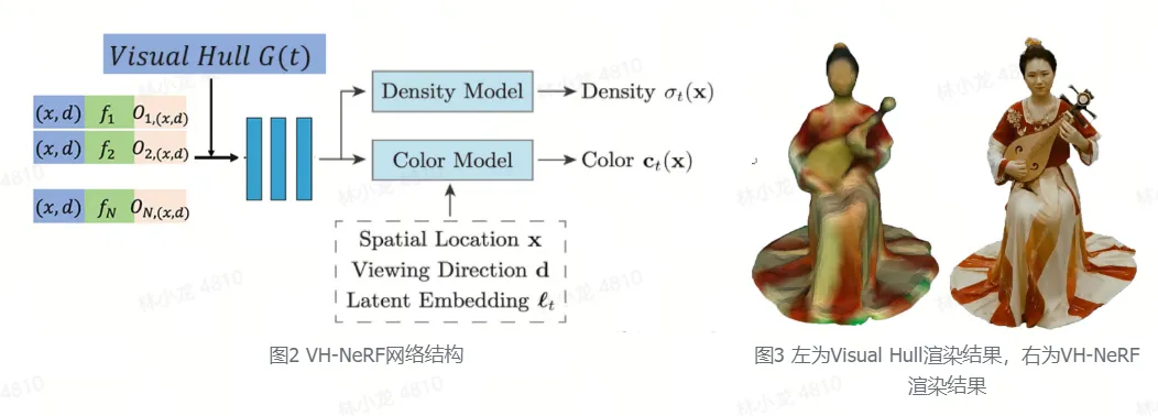 首先火山引擎多媒体实验室使用稀疏的多同步相机阵列进行光场采集,而面对高精度光场重建难题,实验室提出了基于三维人体先验的神经辐射场技术。神经辐射场(NeRF)技术是一种先进的深度学习方法,能够从多视角二维图像中学习和重建三维场景的连续体积表示,并从任意视角渲染出逼真的三维视图。考虑到采集主体多以人物为主,可通过AI模型计算二维人体先验,再利用相机间位置关系投射到三维空间,从而形成了一个粗糙的人体可视外壳。通过训练阶段将辐射场中的光线限制在可视外壳内,可以得到更准确的几何表征,同时也抑制了人体外离群噪声的出现。更重要的是,光线遍历的范围大幅减少,极大的降低了辐射场生成的时间。