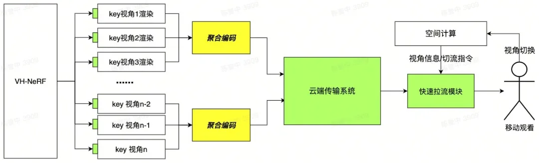 可以看到,人物模型会首先被转换为一系列多视角的视频帧,随后通过高效的聚合编码技术,这些帧以离散化的视频流形式被优化压缩,确保了与现行视频编码标准的完美对接。在移动设备端,实验室独立研发的空间计算模块能够实时捕捉用户的视角和位置变化,迅速转化为精确的切流指令,指导快速拉流模块获取并呈现相应的视频内容。特别值得一提的是,直播技术团队开发了快速拉流算法,可以实现了低于100毫秒的超低延时切流,保障了视角转换的无缝流畅,而空间计算技术除了加深用户与三维视频内容的互动,还承载了三维场景与视频内容的融合,极大地增强了沉浸感,为用户带来了前所未有的观看体验。