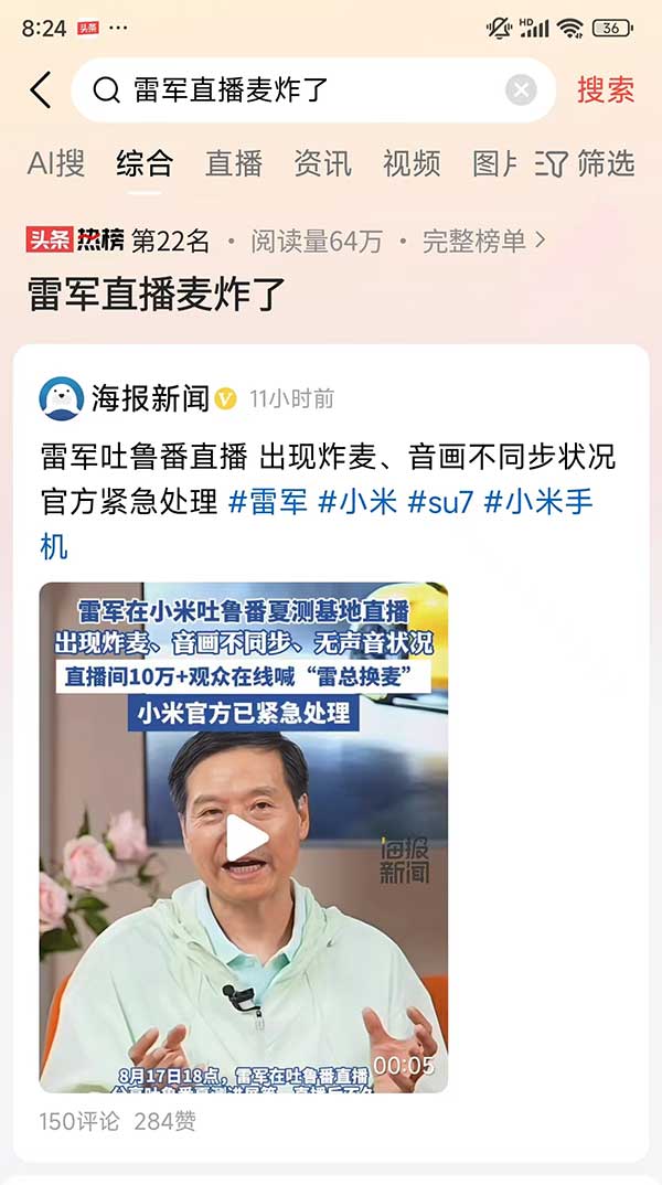 2024年8月17日,雷军直播“炸麦”了火速上热搜。事件起因是雷军在小米吐鲁番夏测基地进行直播时,多次出现炸麦、音画不同步等问题。