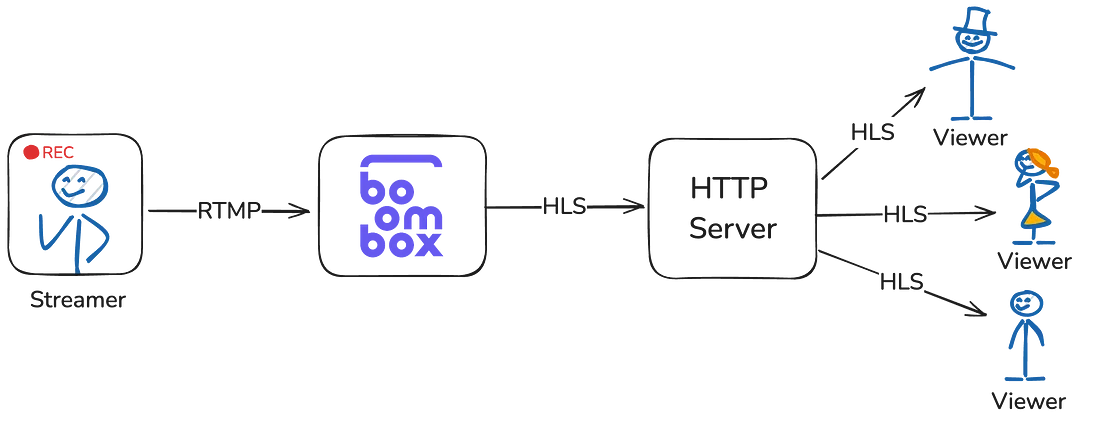 Boombox 可以让你使用各种协议和格式来传输多媒体: WebRTC、RTMP、RTSP、HLS 和 MP4。让我们考虑这样一种情况:某人通过 RTMP 发送流(如来自 OBS 的流媒体),然后通过 HLS 向更广泛的公众进行广播:
