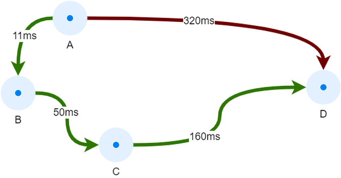 实时音视频对网络的要求非常高,如果通话双方距离很远,那么通话质量是很难保证的。城市A的设备给城市D的设备发送数据,直接发送未必是合适的选择,从城市B和城市C中转一下有可能更快。理想的解决方案是在全球部署加速节点,用户就近接入。根据加速节点之间的实时网络质量探测数据,找到一条合适的传输路径,避开网络的拥堵。