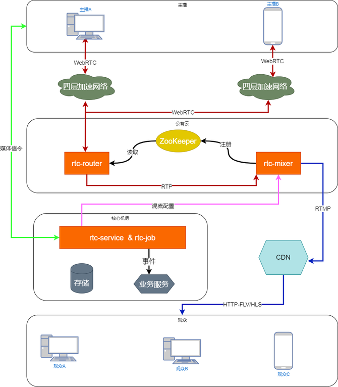rtc-mixer负责混流,根据需求拼接画面和混音,然后推送到CDN,观众通过CDN拉流。