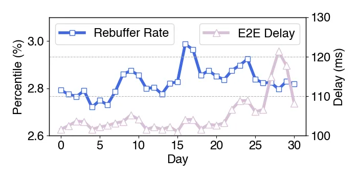 - 业务体验显著优化:对于渗透用户,视频卡顿率和端到端延迟都有显著优化,尤其对于长尾延迟的优化效果更加明显(端到端延迟90分位数-5.695%)