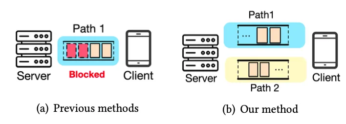 首先要解决数据如何在多条路径之间传输的问题。面对超低延迟的要求,传输协议需要在当前路径发生问题之前,提前使用其他稳定路径进行数据传输,才能保证体验不受影响,这要求数据调度算法能够灵敏地检测出弱网并快速做出反应。除此之外,调度还要解决多路径延迟异构性带来的队头阻塞问题以及重传问题。