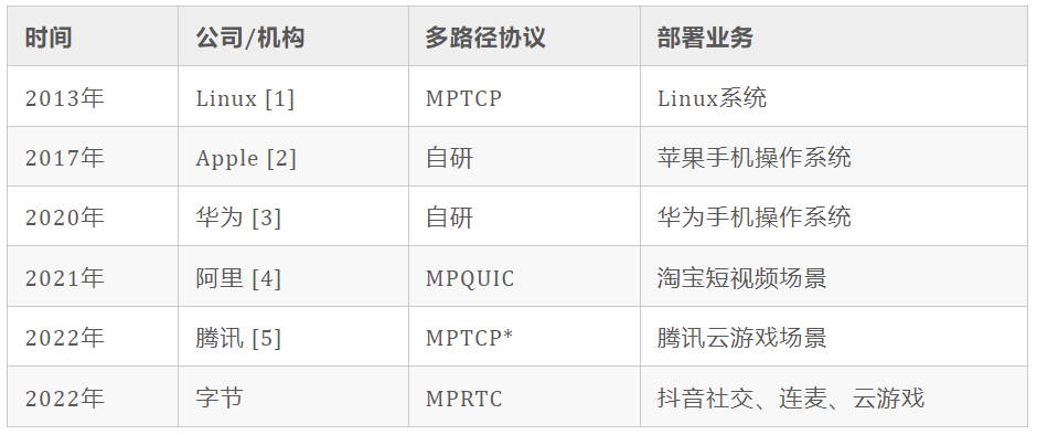 同时,我们也关注到近年来工业界对多路径的兴趣度显著提升,许多公司已经开始尝试在不同业务上部署多路径。目前,多路径的应用场景主要还集中在数据中心、点播、直播等延迟要求不高的场景,而实时通信场景应用多路径的探索才刚刚起步,业界也缺乏通用的多路径超低延迟传输协议标准。