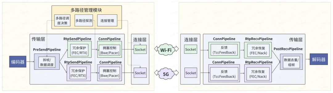 如何设计一套通用的超低延迟多路径传输协议和架构同样具有很大的挑战。架构上需要保持稳定性和健壮性,要保证架构可以在兼容单径传输方式和多径传输,需要对原有RTC传输框架每个模块进行重新设计和扩展。算法上要提供灵活性和弹性,提供不同等级的延迟和画质保证能力,以支持不同类型的超低延迟应用。