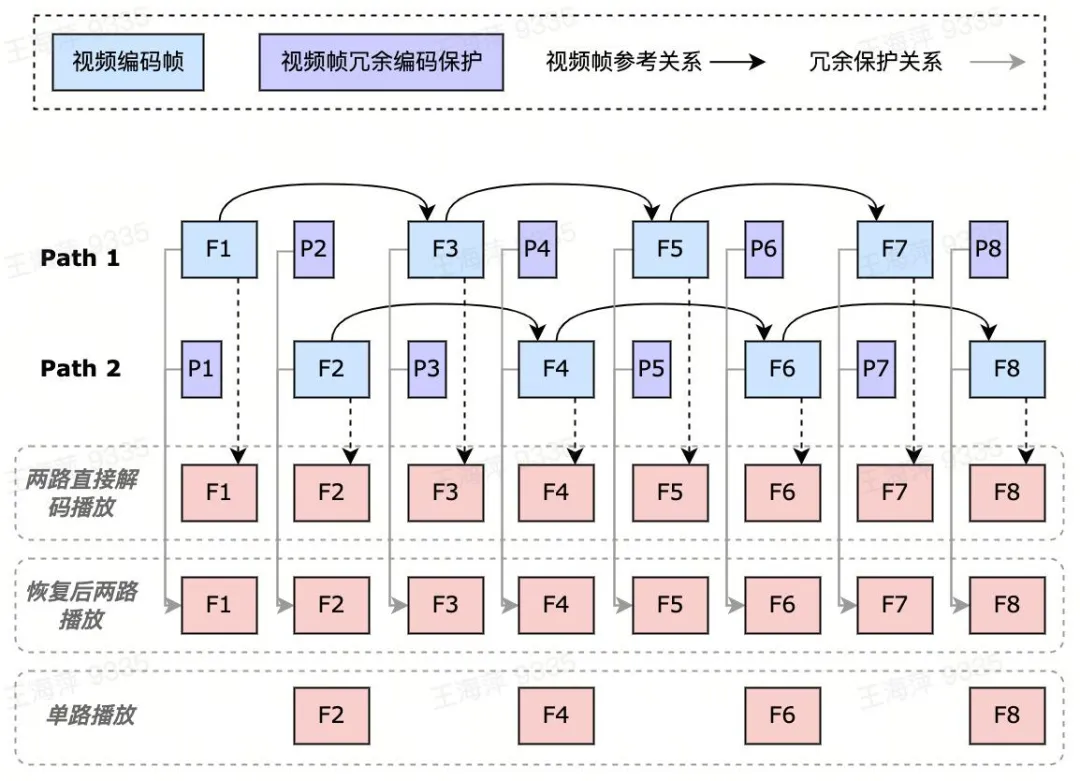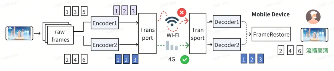 传统编码方案的问题在于,视频帧被拆分到不同路径上后会存在严重的“队头阻塞问题”,即快路径的数据要等慢路径的数据到底以后才能解码,因此使用多路径可能比单径卡顿更严重。视频切分联合编码技术可以编码出多条可以独立传输和播放的视频帧序列,任意一组视频序列(一条路径)到达后可以独立播放,极大地提高了抗弱网能力;多条路径的视频帧序列同时到达可以组合播放,极大提升了视频画质。同时,我们还通过联合码控、冗余保护等机制来提高多路编码的编码效率。