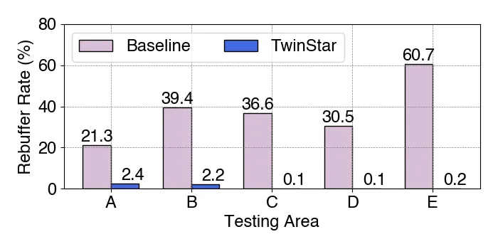 客观体验指标:首先,客观体验指标优化显著,部分场景接近零卡顿效果。相比单径传输,TwinStar视频卡顿率-96.82% ,端到端延迟-80.44% 。