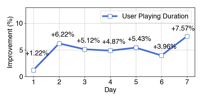 - 用户游戏时长提升:对于云游戏来说,最重要的QoE指标是用户游戏时长。对比实验组和对照组中渗透用户的人均游戏时长可以看到,实验组的游戏时长明显提升,日均时长 +1.22%~+7.57% 。