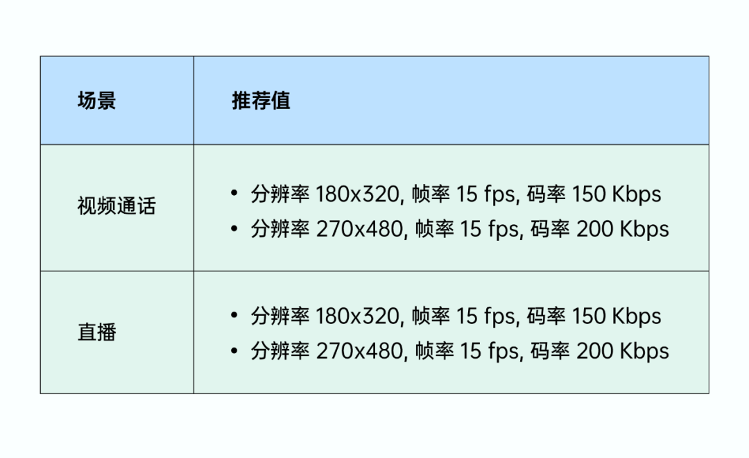 高分辨率、高码率会保证高质量的视频,但同时会增加对宽带的压力,可能导致卡顿。 如果是一对一视频通话场景,要求实时性较高,画面清晰,这时候使用低分辨率即可,相应帧率和码率也要低一些,会减少对宽带的压力。如果是直播场景,要求画面细腻,平滑,这时候使用尽量高的分辨率,相应帧率和码率也要高一点,但会增加对宽带的压力。 一般可参考以下场景中推荐的值进行设置: