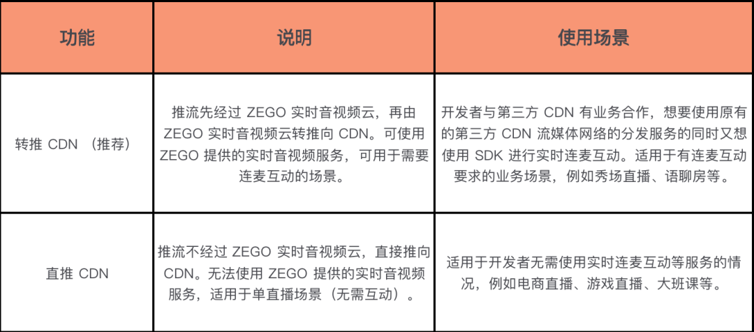 ZEGO Express SDK 支持推流到 CDN(Content Delivery Network,内容分发网络),包括转推 CDN 和直推 CDN 两种功能。开发者基于该功能可打通 RTC 产品和 CDN 直播产品,方便用户从网页或第三方播放器直接观看和收听直播内容。为了保证安全,推流到 CDN 时默认开启 CDN 鉴权。