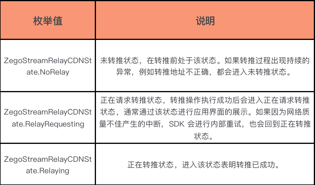 开发者可通过注册 publisherRelayCDNStateUpdate 获取添加/删除转推 CDN 地址状态回调。在 ZEGO RTC 服务器将音视频流转推到 CDN 后,如果 CDN 转推状态发生变化,例如出现转推停止或转推重试,将会收到此回调。