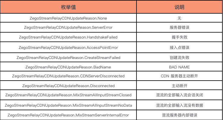 转推 CDN 信息 ZegoStreamRelayCDNInfo 包含了 CDN 推流的 URL、转推状态、转推状态变更的原因、状态发生的时间。ZegoStreamRelayCDNInfo 内所有参数如下: