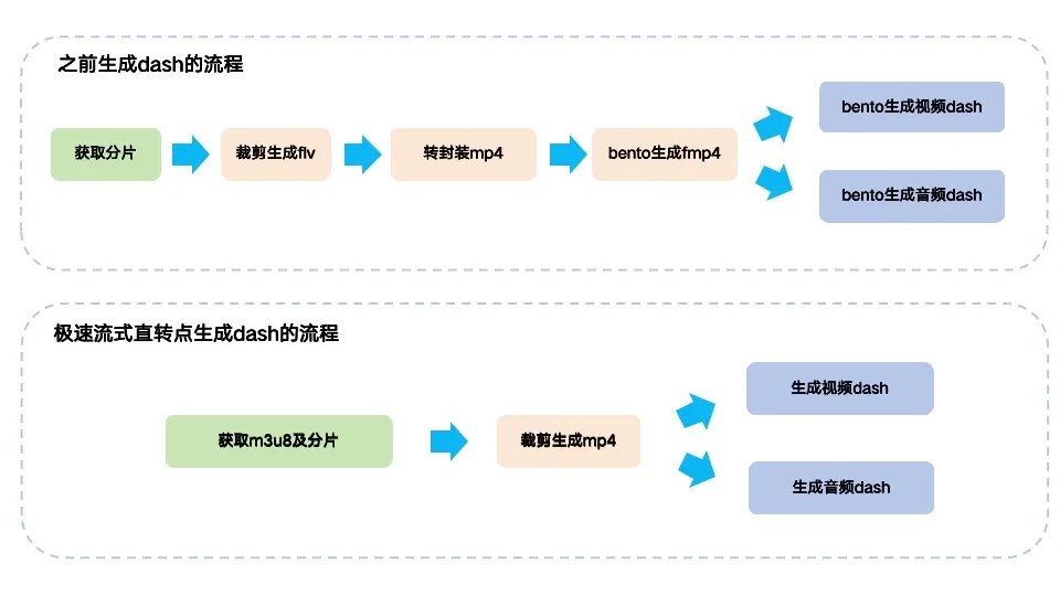 在老流程中,生产流程需要先获取到剪辑所需分片,根据剪辑的起止时间裁合并裁剪出对应的FLV产物,之后会对FLV再转成Dash,生成点播清晰度的各个产物。同时,由于稿件生产流程是由稿件原片驱动的,为了尽可能兼容稿件生产的上下游系统,快速直转点流程也需要一个占位原片,这次原片的生成与一次剪辑的耗时是接近的。