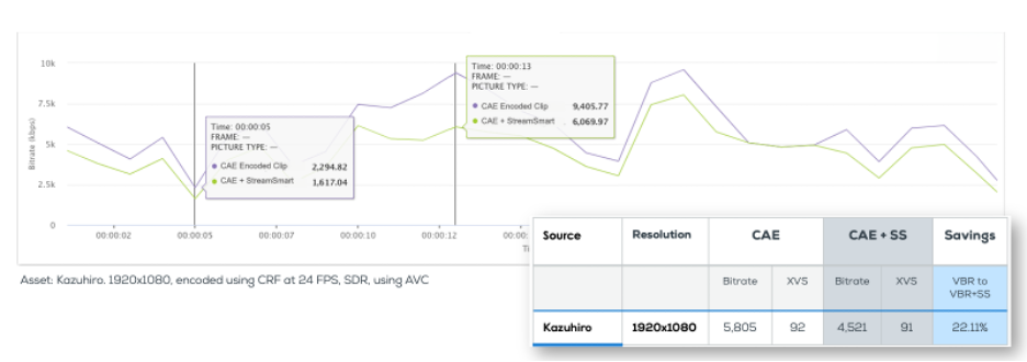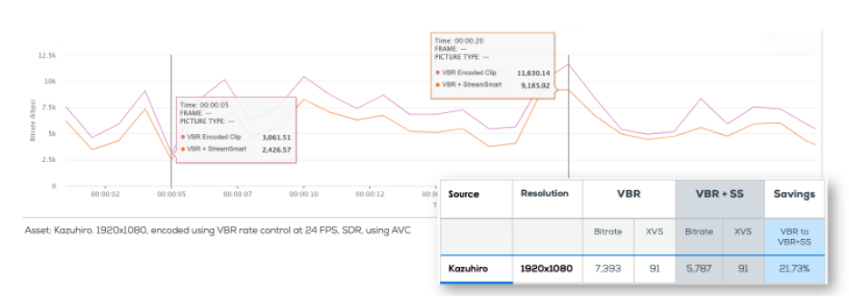 与码率控制方法不同,IMAX StreamSmart 将 XVS 测量与实际优化相结合,动态降低带宽,同时密切关注观众评分。最重要的是,它可与现有的工作流程(VBR 或 CAE)一起使用,在不影响质量的情况下进一步优化比特率。