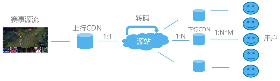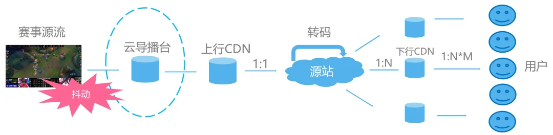 一般的直播系统链路如下,用户推流到直播的源站,然后经过直播转码系统,再通过下行CDN分发给用户。这种情况下源流的卡顿会在链路中持续放大,如果直播间观看人数很多,下游大量用户观看卡顿时可能会刷新房间或者重试某些接口,导致房间页部分功能QPS直接激增,引发问题。