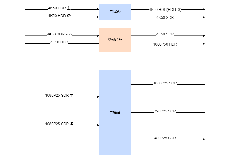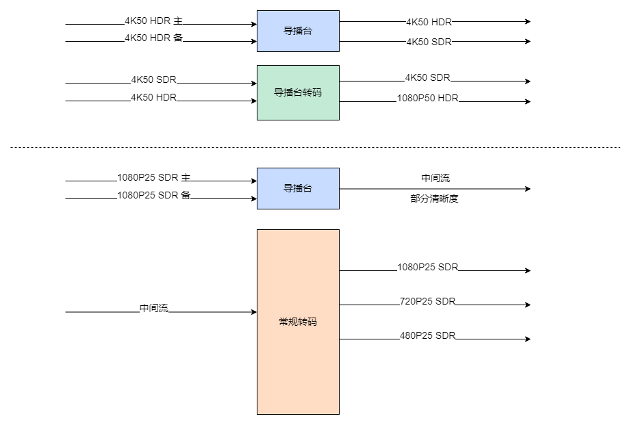 这下好了,不用做SDR2HDR了, 但是新的问题来了,如何为无法播放4K50FPS HDR的用户提供替代方案?要给他们生产一个4K50FPS的SDR清晰度。一般的方法为用4K50FPS的HDR去做HDR2SDR的颜色变换,或者使用1080P25FPS的SDR超分插帧到4K50FPS的SDR。后者有较大的性能压力,很难实时,决策下选择HDR2SDR的方案。同时考虑到主备多活,我们最终的导播台转码链路图设计如下。使用2个导播台,分别拉央视的主备流,且将输出的清晰度拆成了两部分,包括1080P25及以下清晰度和1080P50HDR及以上清晰度,考虑到单机器性能负载,其中导播台只负责稳流和进行颜色转换输出用于转码输入的原画P清晰度,其他对用户开放的清晰度交给了直播转码系统来做(注意这里,要考的)。