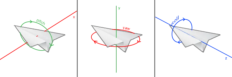 欧拉角是三个值,可以表示 3D 中的任何旋转,由莱昂哈德·欧拉在 1700 年代的某个时候定义。有三个欧拉角:_俯仰角_、_偏航角_ 和 _横滚角_。下图以视觉方式给出了它们的含义: