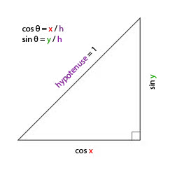 如果我们定义斜边的长度为 1,根据三角函数(SOH CAH TOA),我们知道邻边的长度为 cosx/h = cosx/1 = cosx,对边的长度为 siny/h = siny/1 = siny。这为我们提供了在直角三角形中 x和 y边的长度的通用公式,具体取决于给定的角度。让我们使用这个来计算方向向量的分量。
